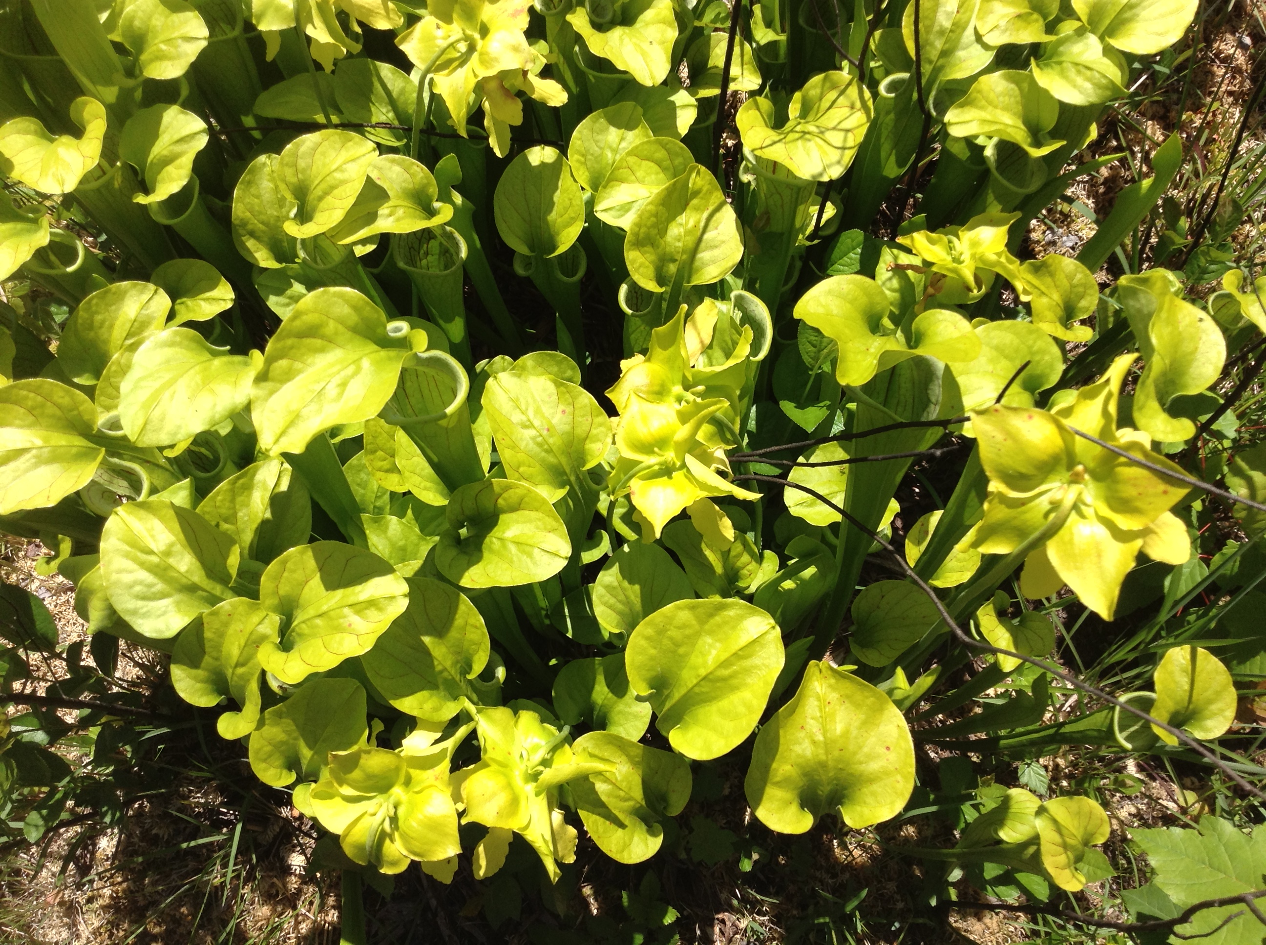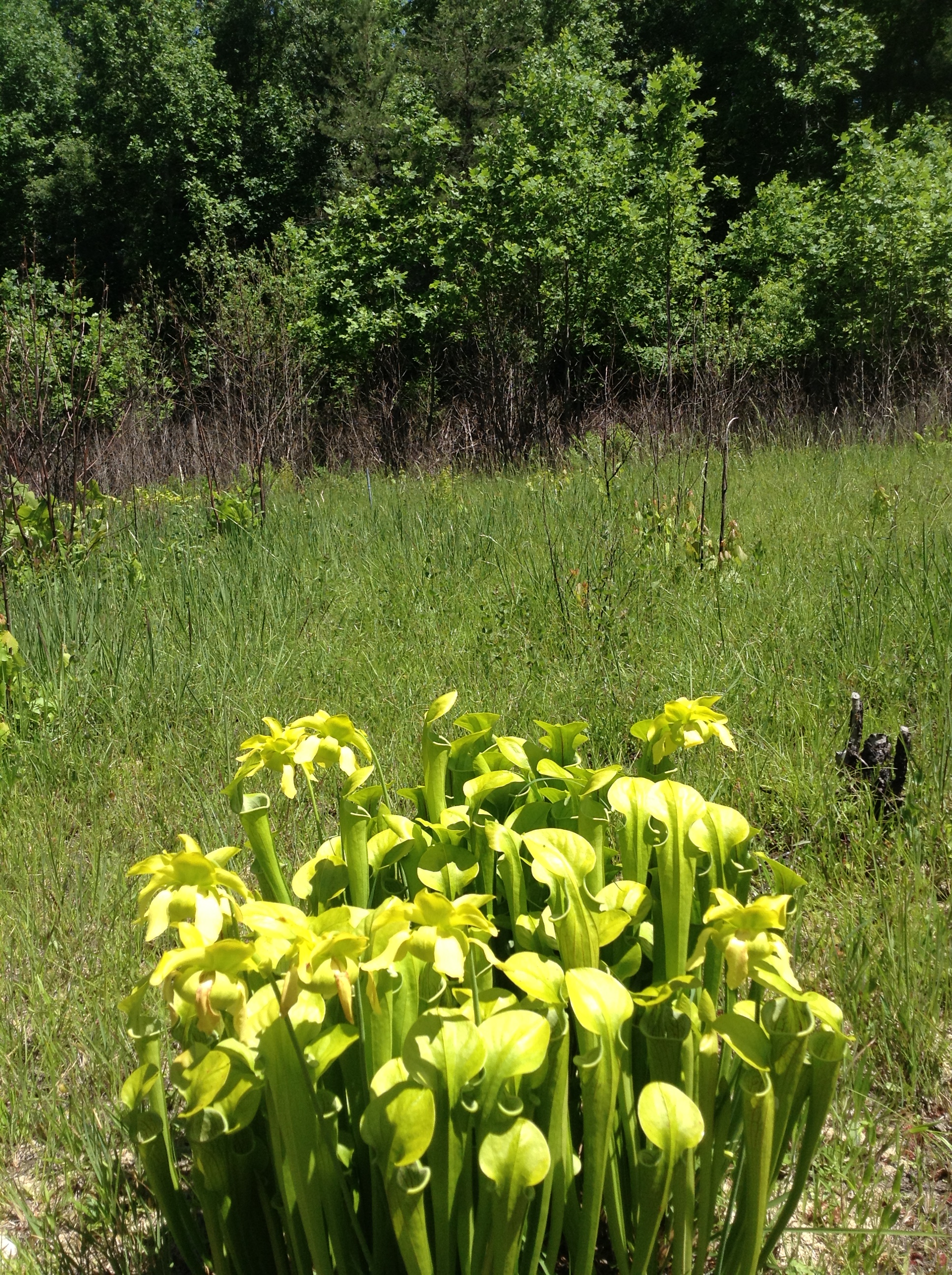 The carnivorous green pitcher plant used to be much more common throughout the Piedmont, but development and draining of wetlands, fire suppression, and other factors have driven the species to near extinction. An important feature of this site that has allowed the species to continue to thrive here is a thick layer of clay soil near the surface. This clay prevents water from soaking quickly back into the ground, and it continues to hold moisture even when the water table drops in summer and fall, giving the plants a sort of water savings account to get them through drier times.